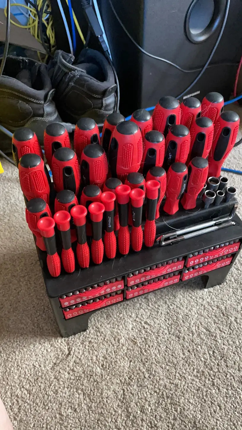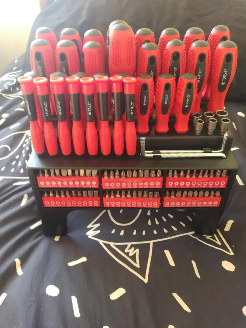 Incluye 100 piezas con destornilladores, puntas, adaptadores y pedestal: el aliado perfecto para el hogar o el taller.